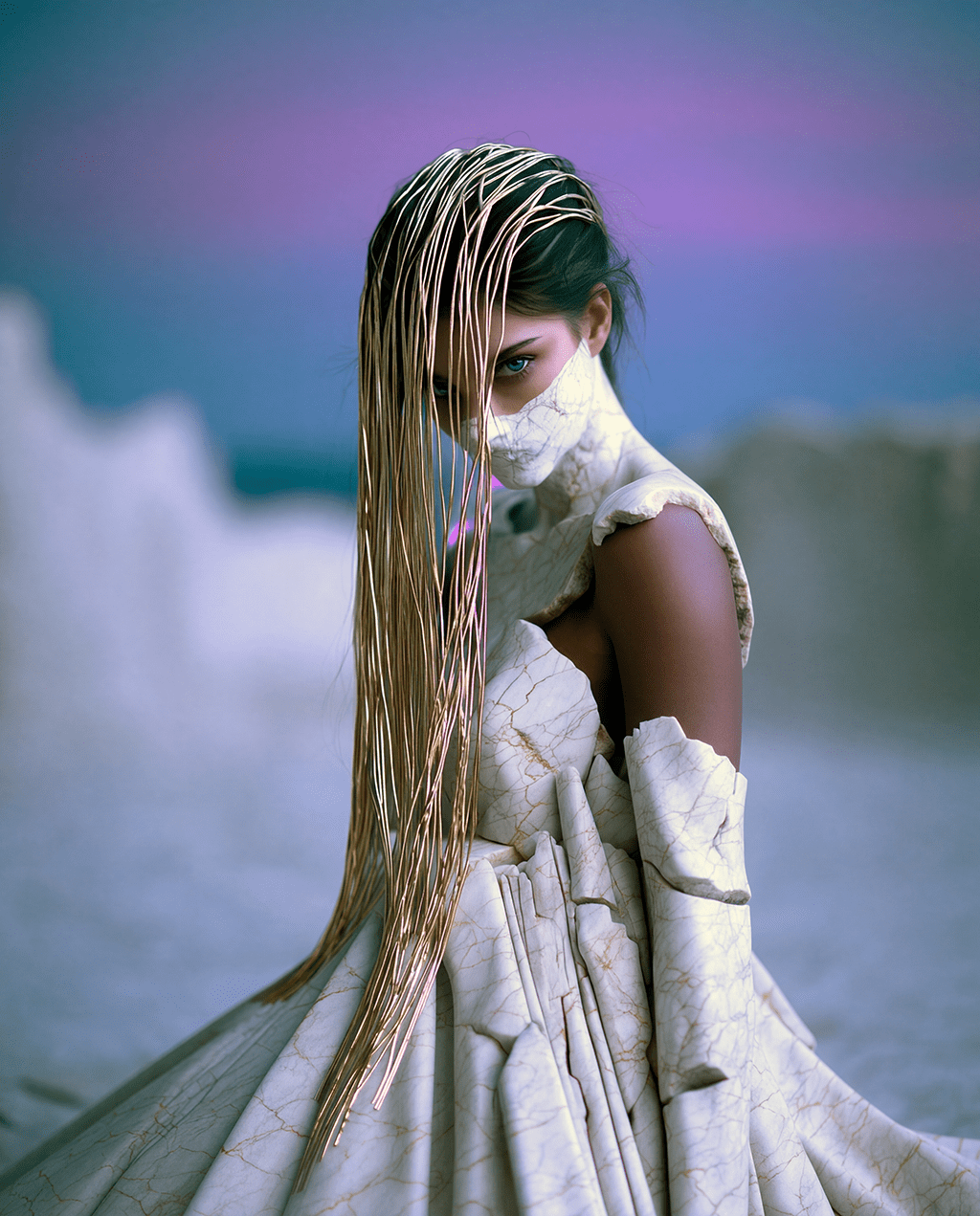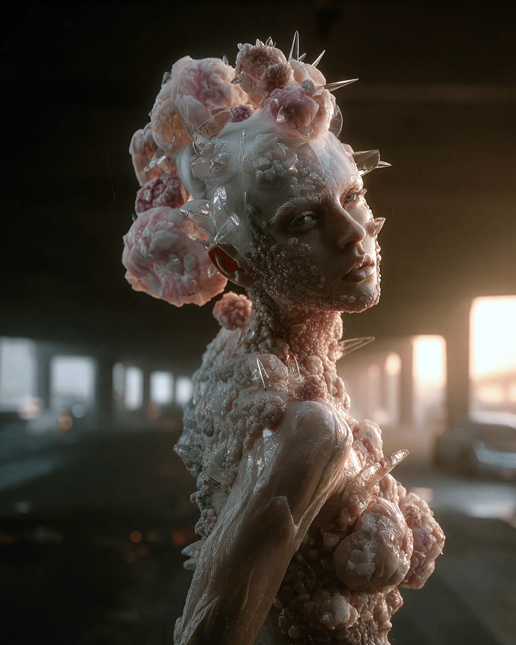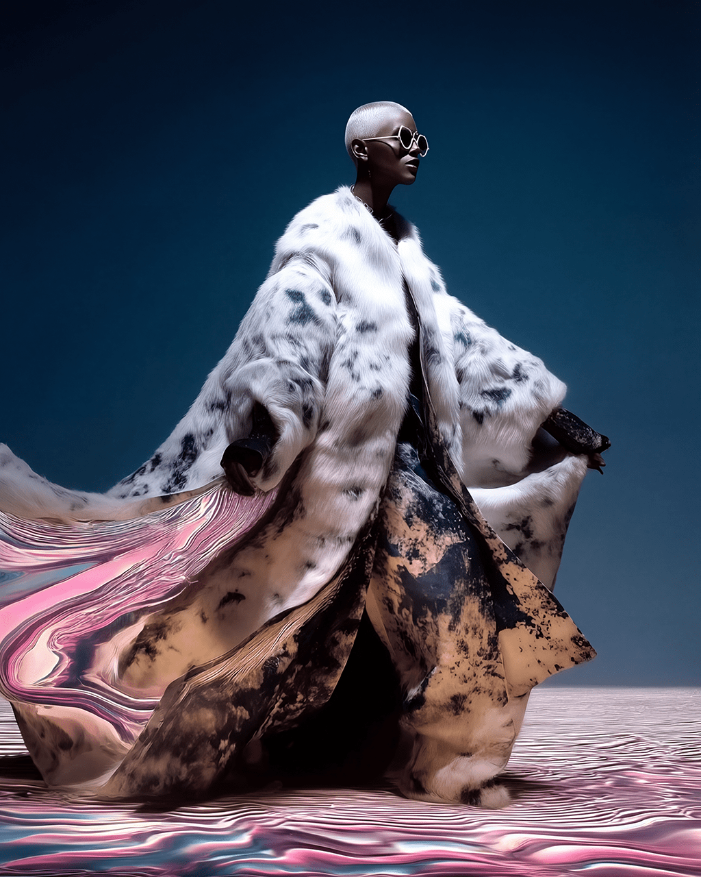 • Trained in fine art photography, he explores the dialogue between texture, body, and reality, transforming the human form into a canvas where material, garment, and surface converge.