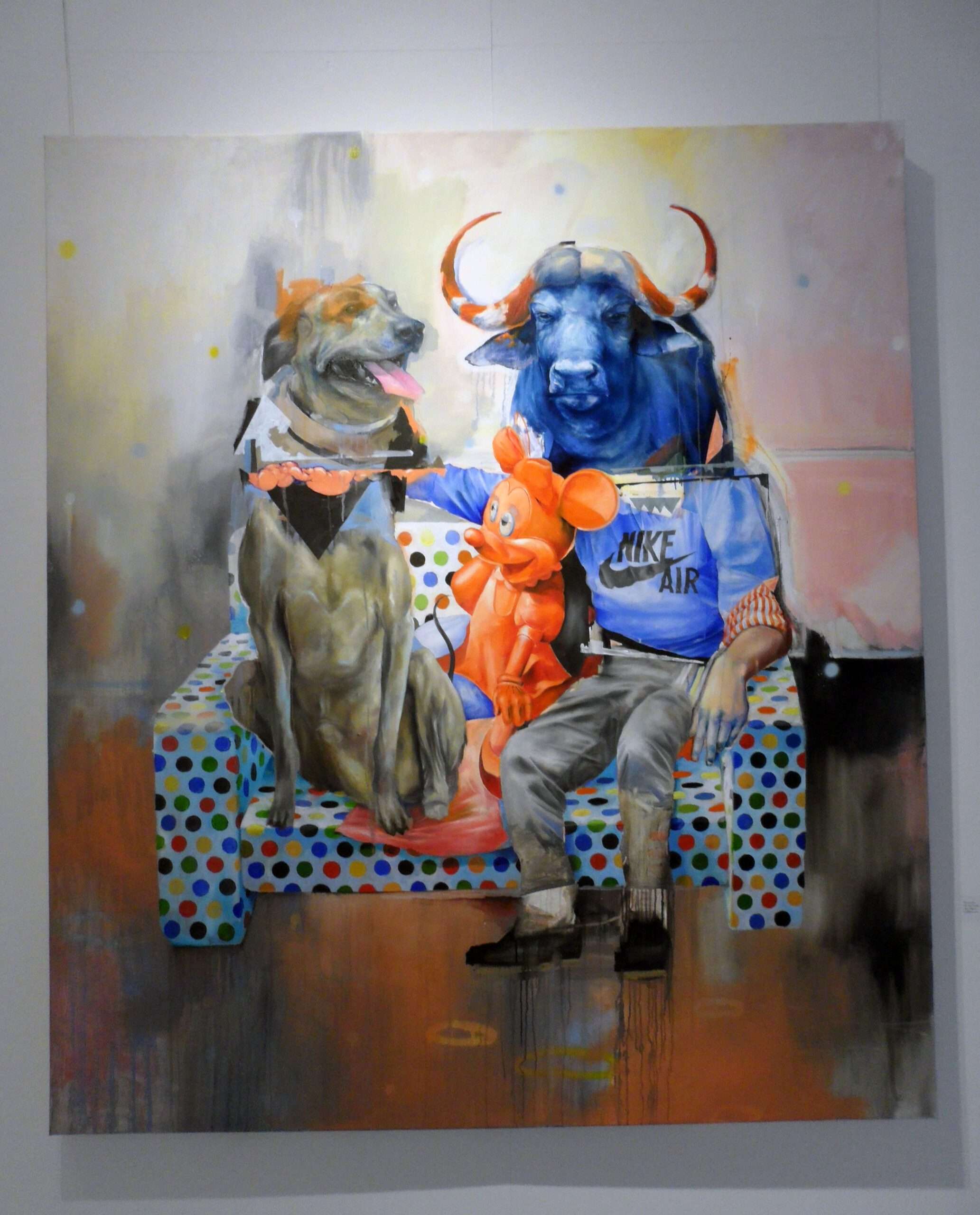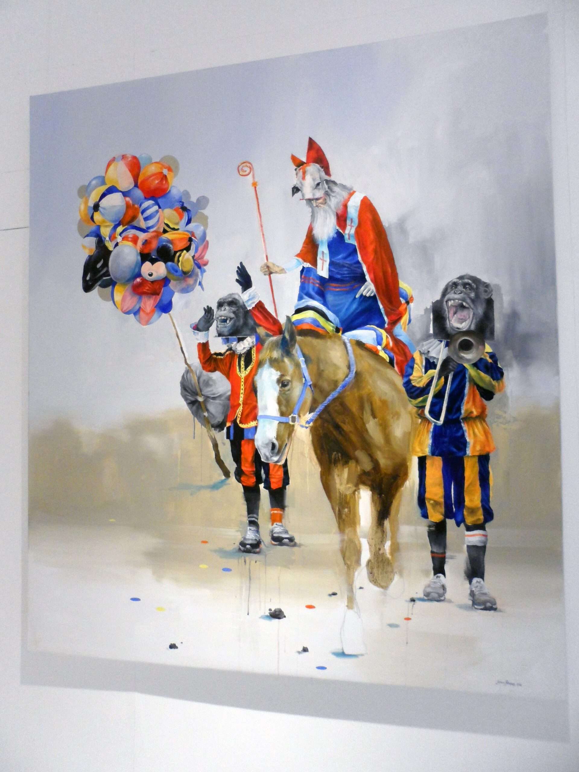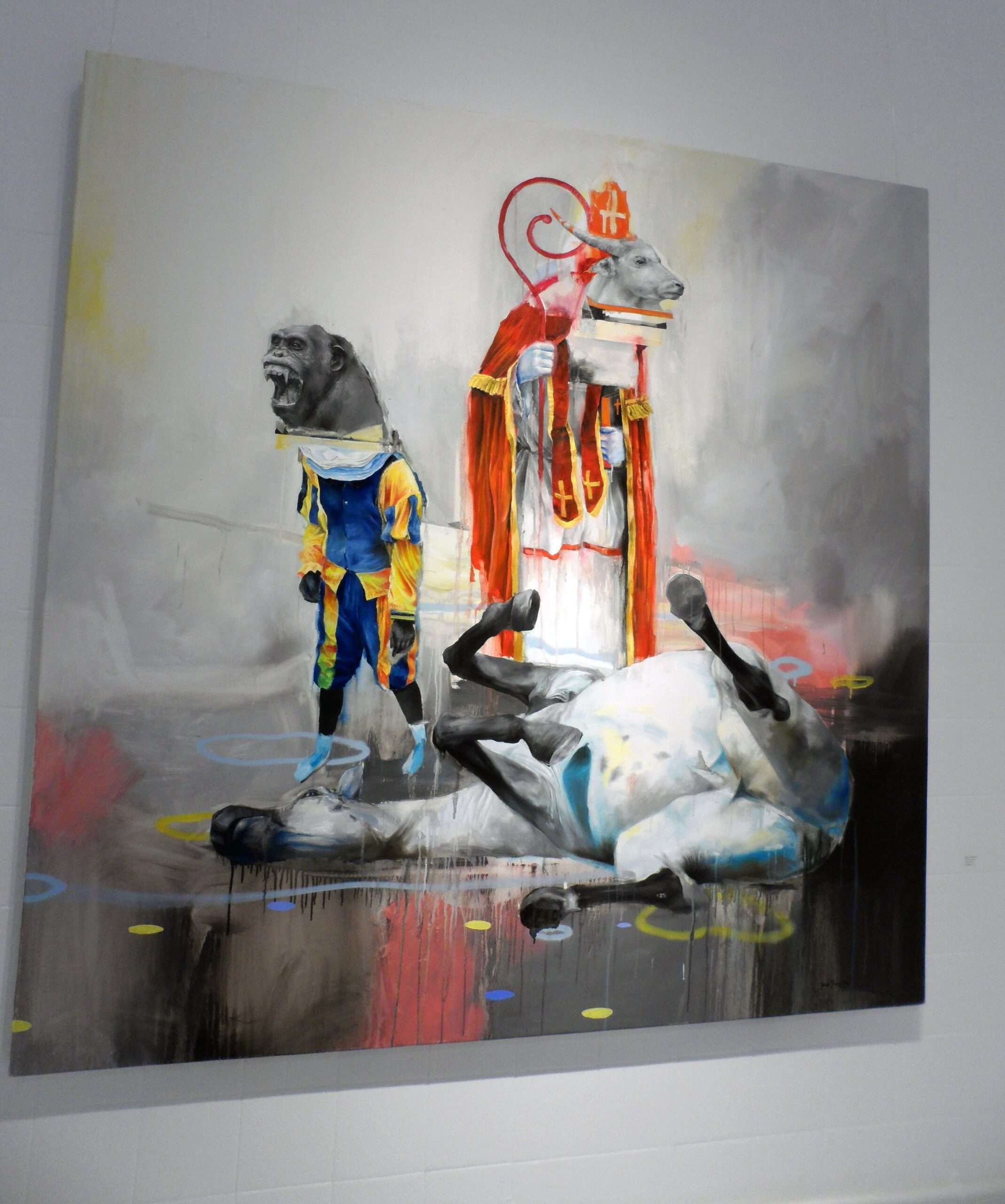 In this body of work, Roukes explores themes of folklore and tradition, placing hybrid human, animal figures within scenes that range from Western folkloric celebrations to everyday customs and behaviours.
