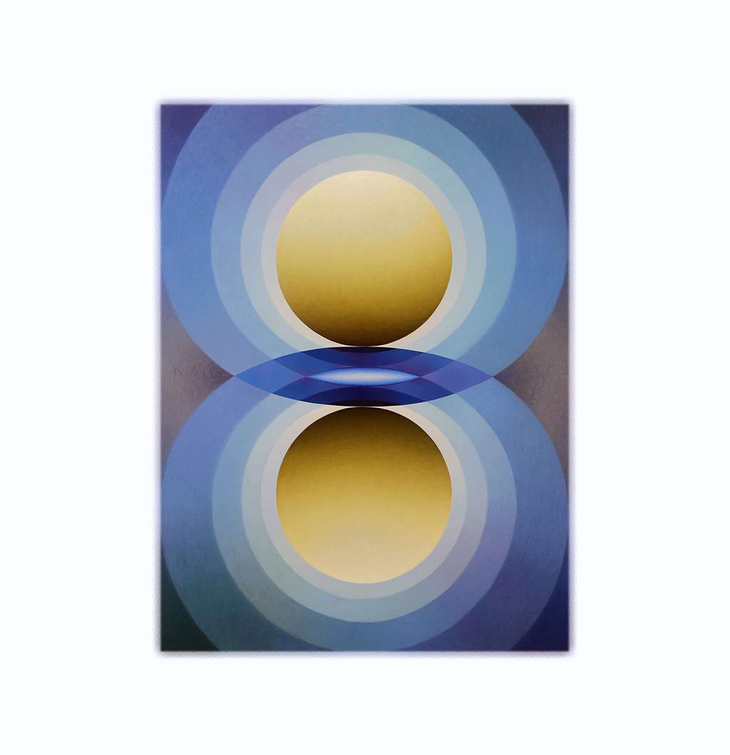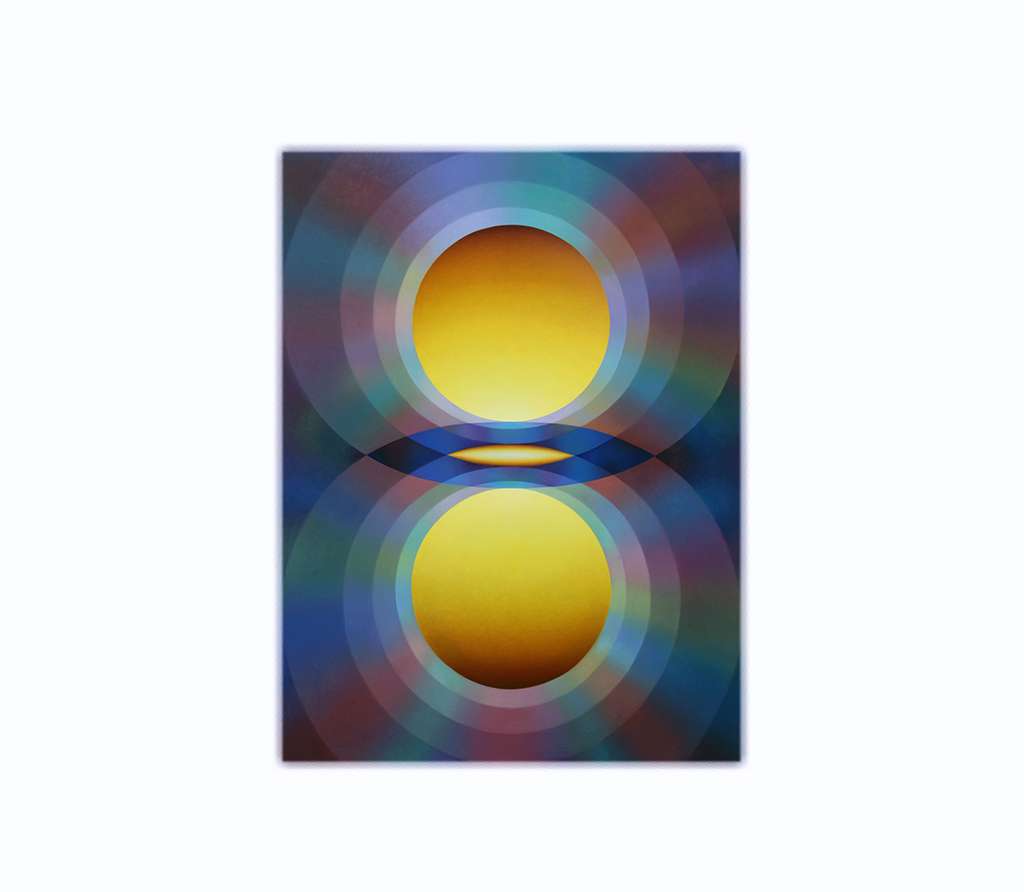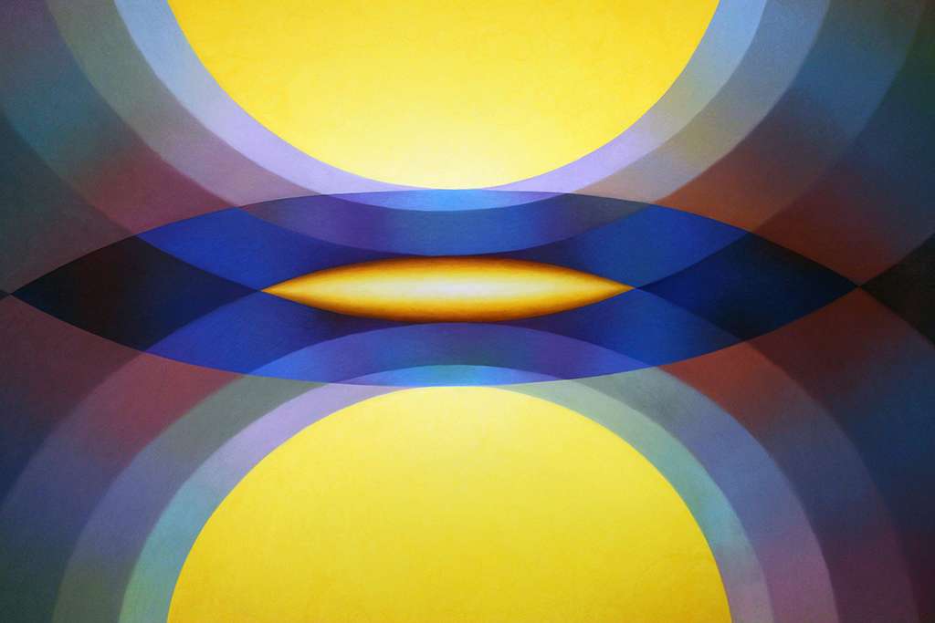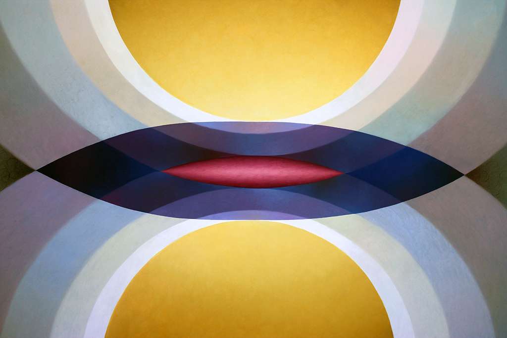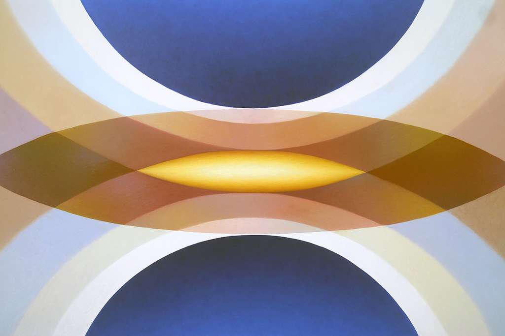 • Over the past decade, Hollowell has built a distinctive visual language using curved, symmetrical forms and soft gradients of colour. Her paintings often draw on recurring shapes like the mandorla and other symbolic forms, creating compositions that feel balanced, rhythmic, and almost meditative.