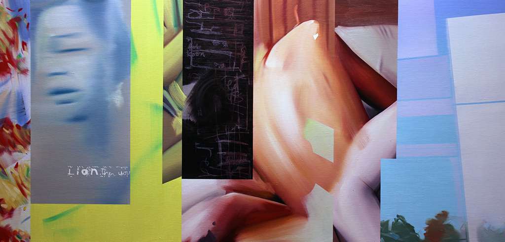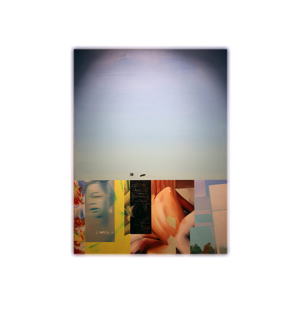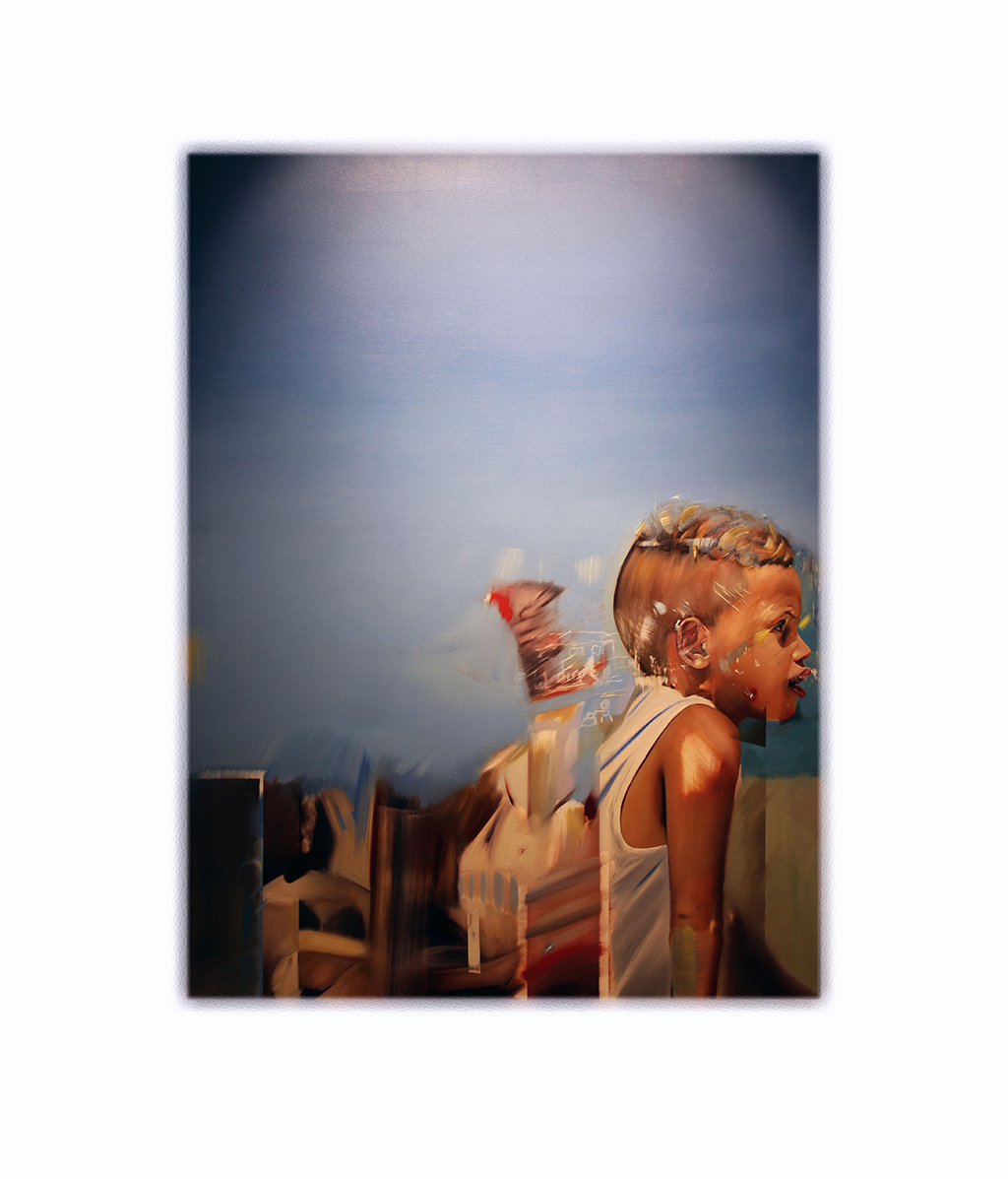 In Hidden Boys, Open Blue, Leech uses layers of oil paint to build compositions that evoke intimacy and tension. Her works often feature young boys set against expansive blue skies, with energetic marks breaking through calm surfaces, symbolising trauma and repressed emotion. These contrasts reflect the emotional fragmentation left by childhood experiences.