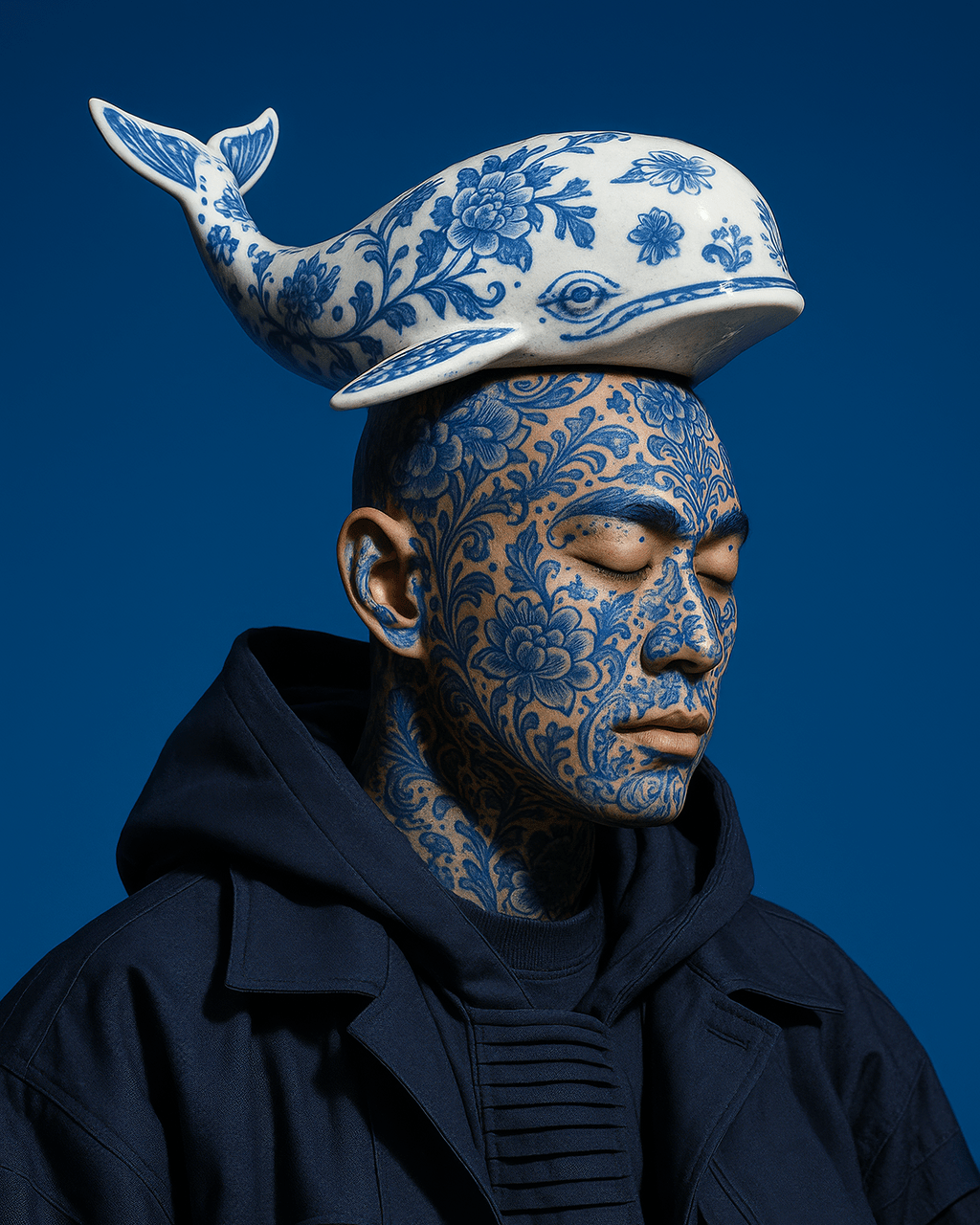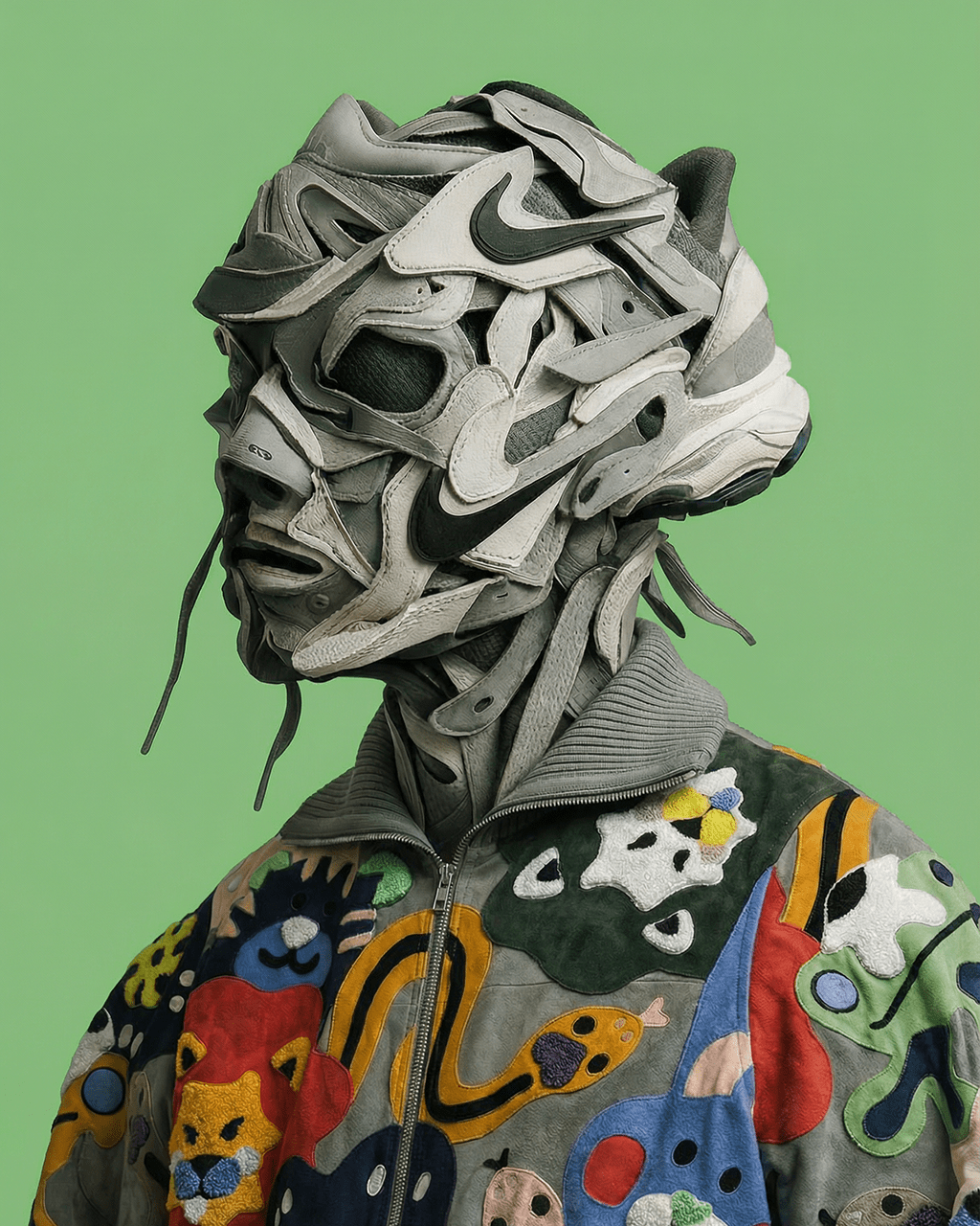Visual excess functions as a deliberate strategy rather than ornamentation: saturated colour fields and precise surface detail sit in contrast to erased or concealed expressions, evoking simultaneous authority and absence.