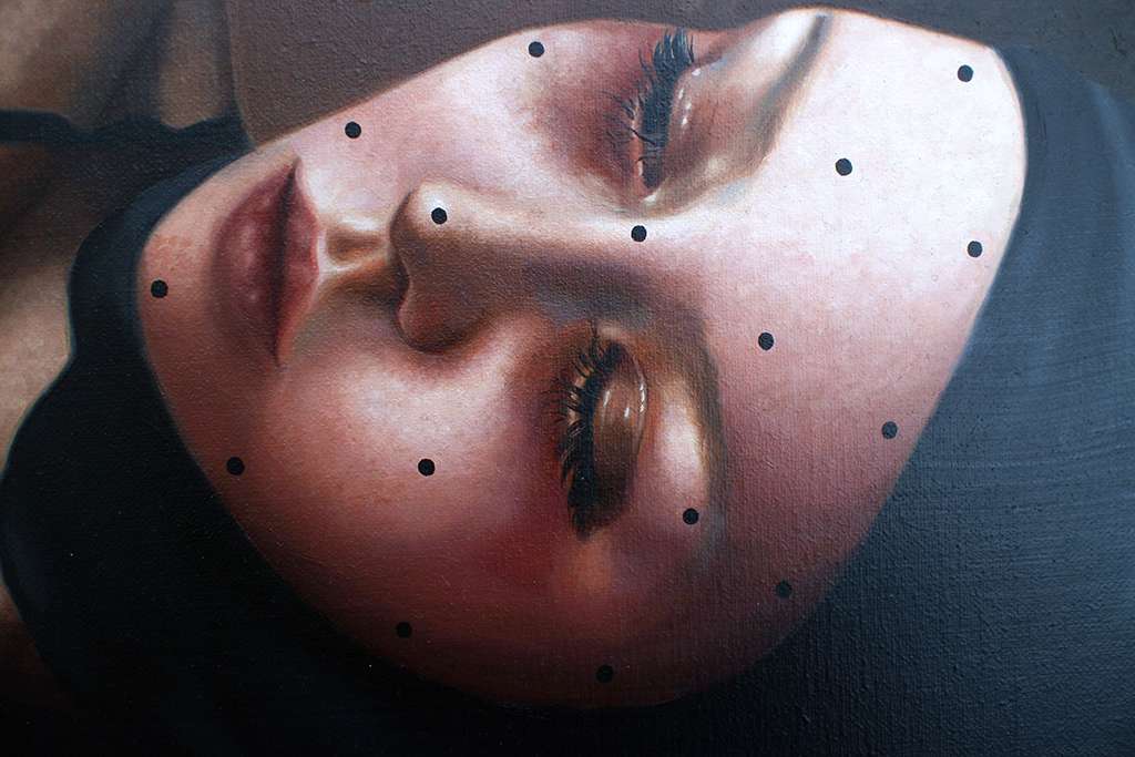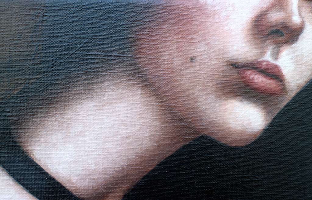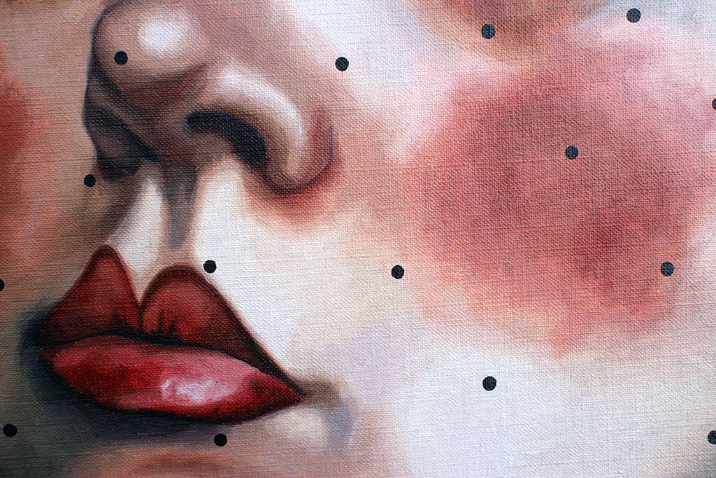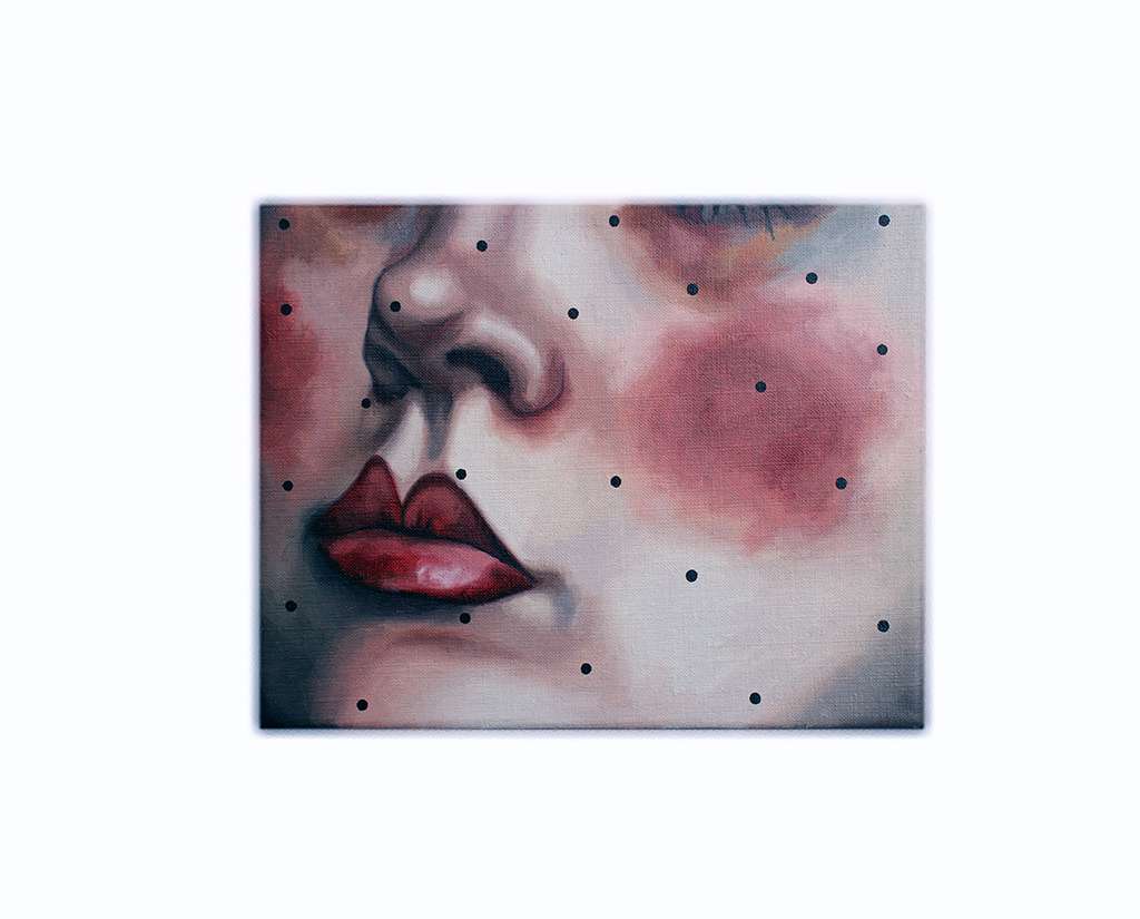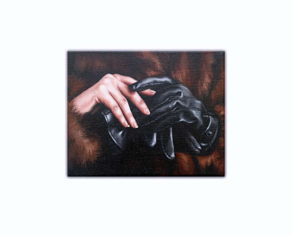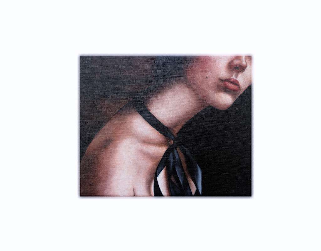 A lot of the work lives in that in-between space: control and submission, reality and fantasy, revealing and hiding. Her brushwork is careful, almost restrained, but then you notice small distortions in the body, details that pull you closer and feel both intimate and slightly off.