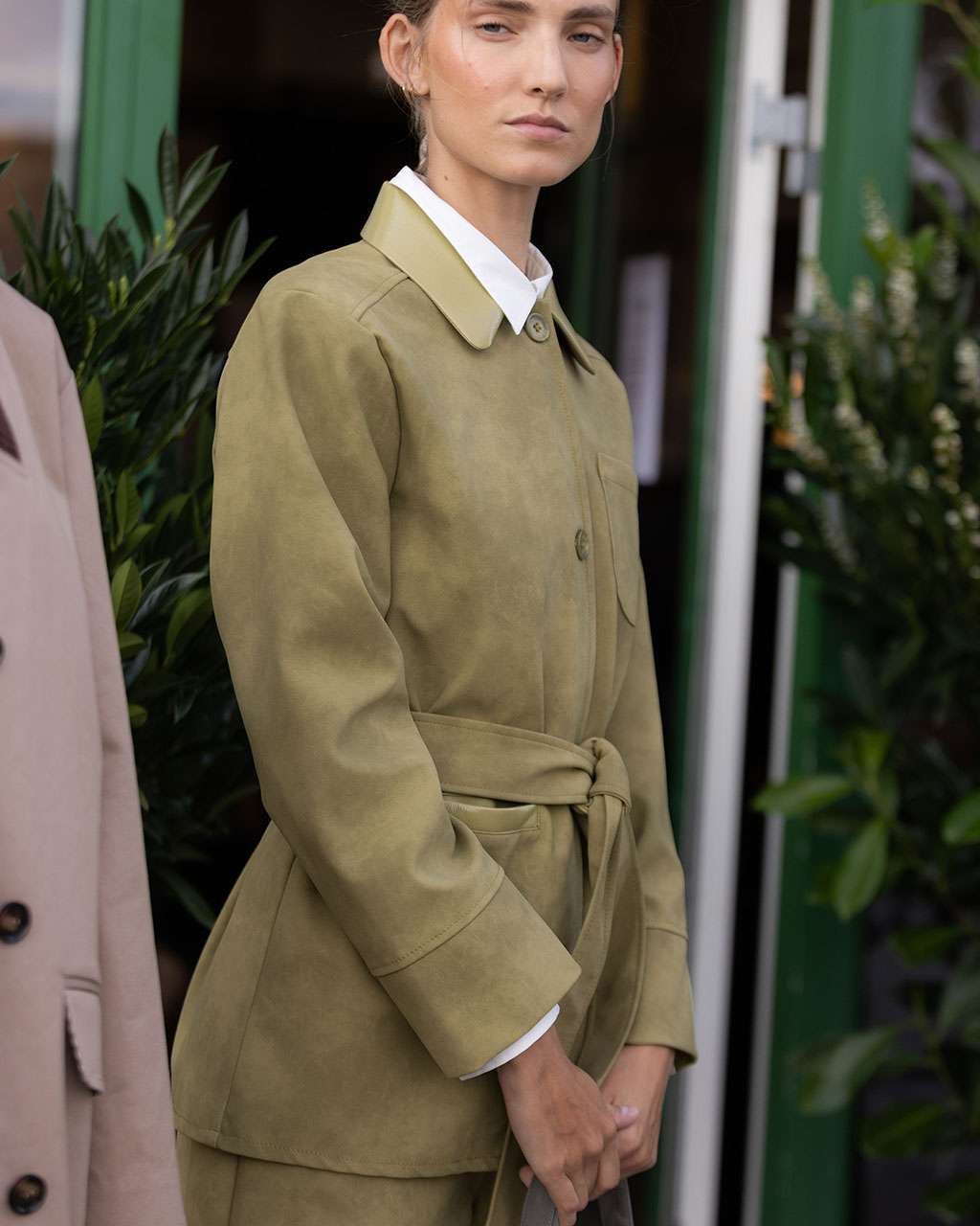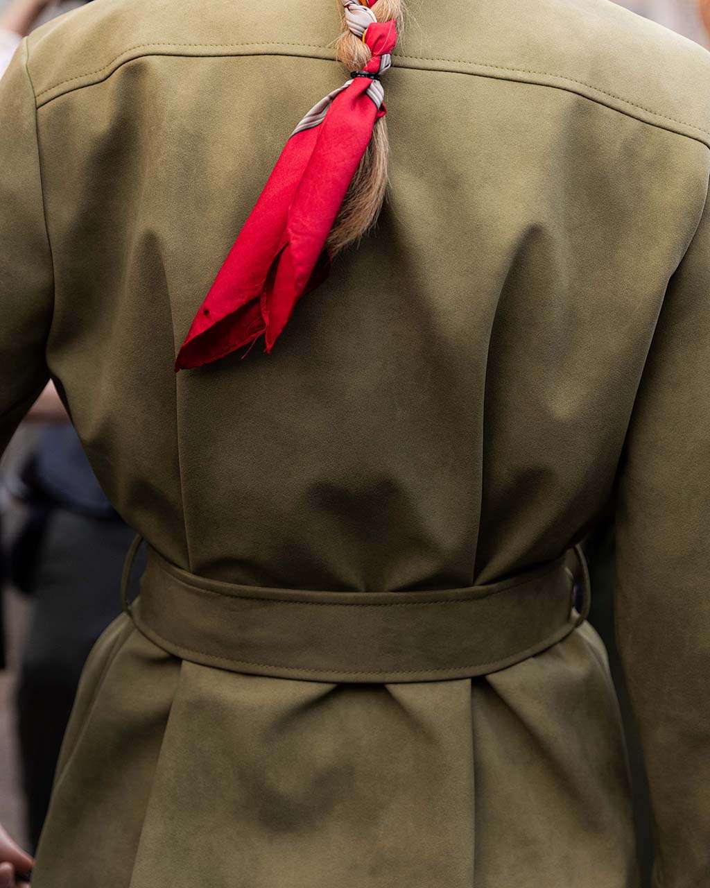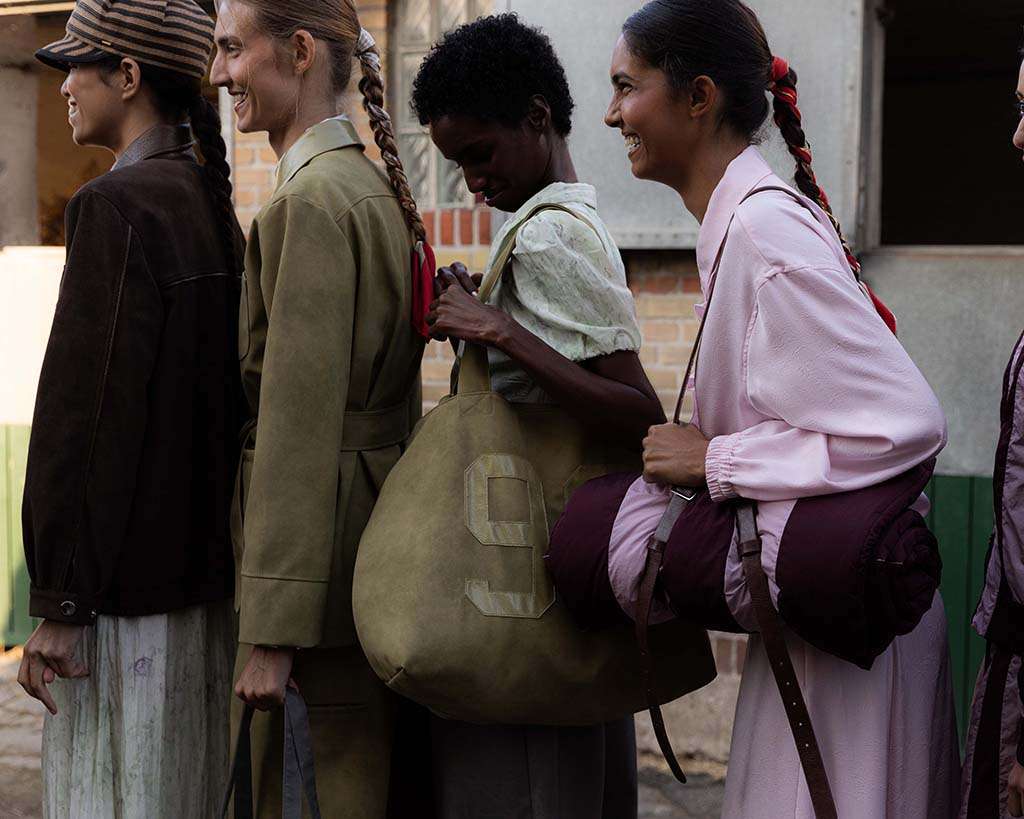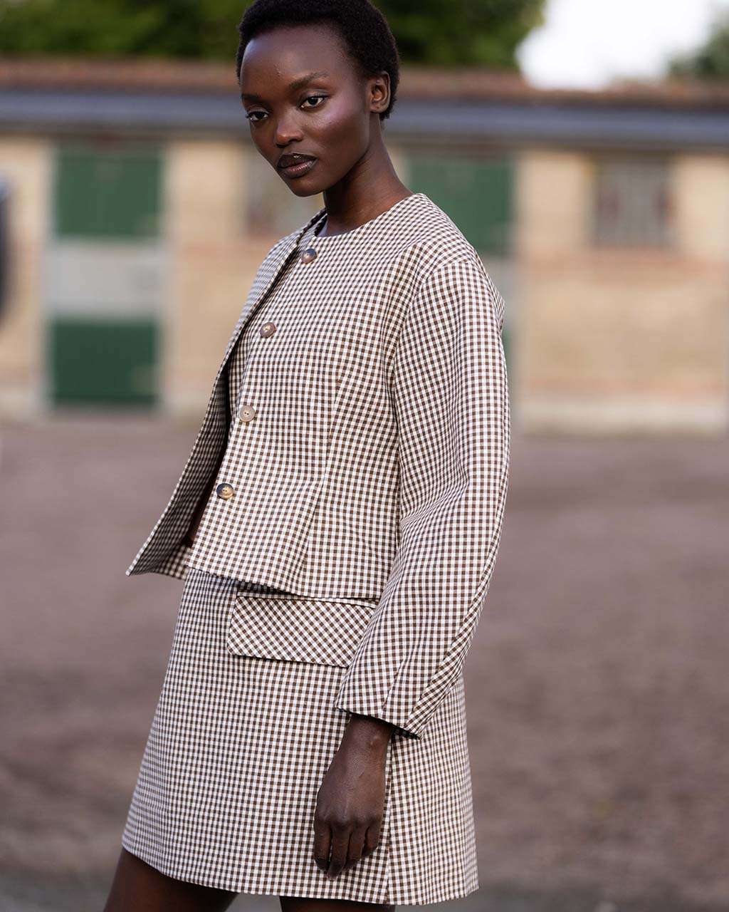 Directors Striped nylon nods to the uniforms of jockeys, while checks and bold colour contrasts add a feeling of movement. Frilled details on sporty outerwear introduce a feminine tension, subtly referencing classic equestrian attire. Dropped waist dresses and softly draped blouses introduce a graceful fluidity, while powder pink hues and faux suede accessories add a touch of composed drama. Horse rosette details and vintage lace pay homage to tradition, as leopard prints and faux leather bring a fresh, modern edge. Notes from the Grandstand captures the beauty of intentional contrast.