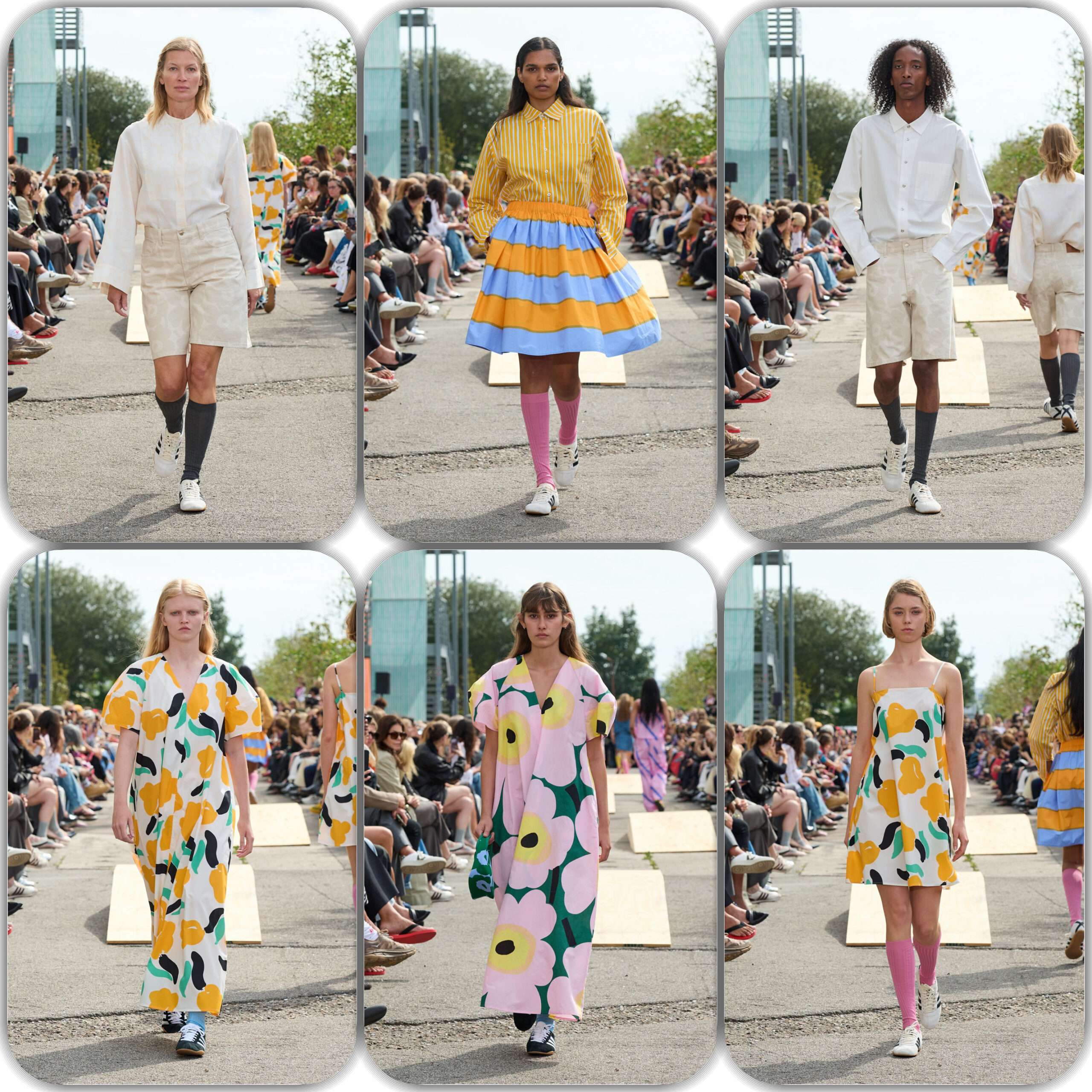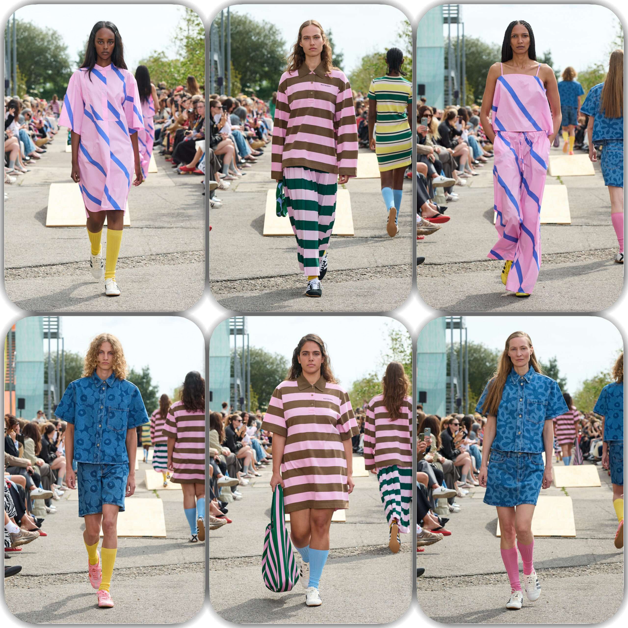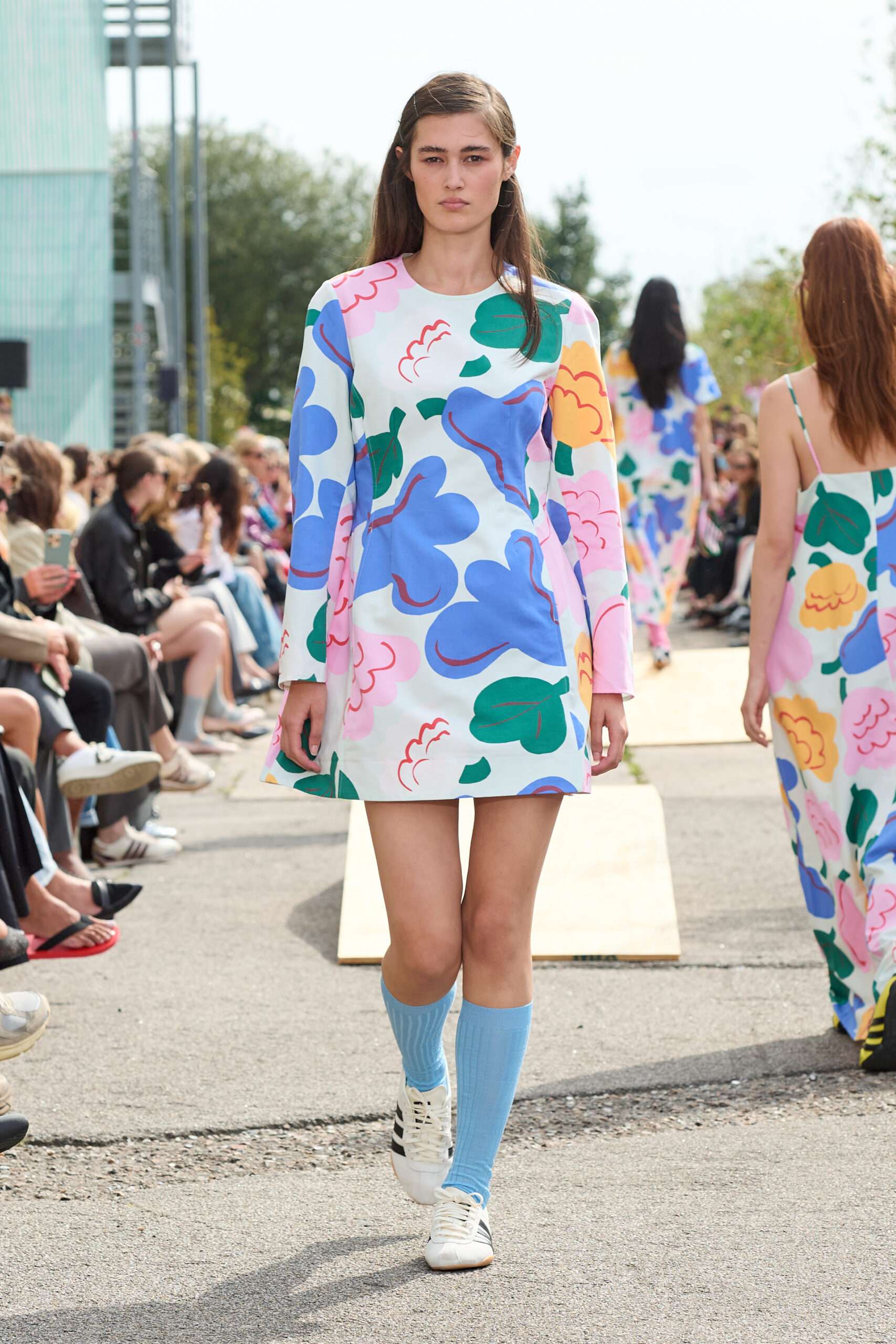Creative Director Rebekka Bay reinterpreted classic Marimekko silhouettes, such as the iconic 1960s Marimini dress, transforming it into a playful summer co-ord set. The collection juxtaposed mini and maxi lengths, layered lightness with utility touches, and floral motifs with graphic stripes, emphasizing both femininity and pragmatism.