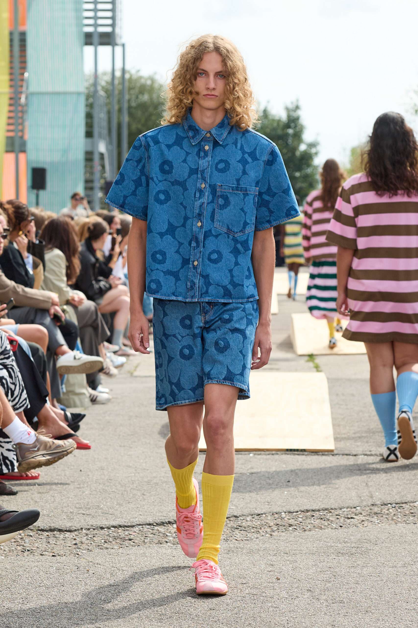Marimekko also celebrated 70 years of the Jokapoika shirt, updating the classic genderless design with contemporary crops, multicolor variations, and oversized prints, while retaining the craftsmanship and iconic Piccolo stripe that exemplifies Marimekko’s artistic integrity. Paired with contrasting adidas Tokyo shoes, the collection brought energy, joy, and creativity to the runway, reflecting the brand’s enduring legacy and playful innovation..