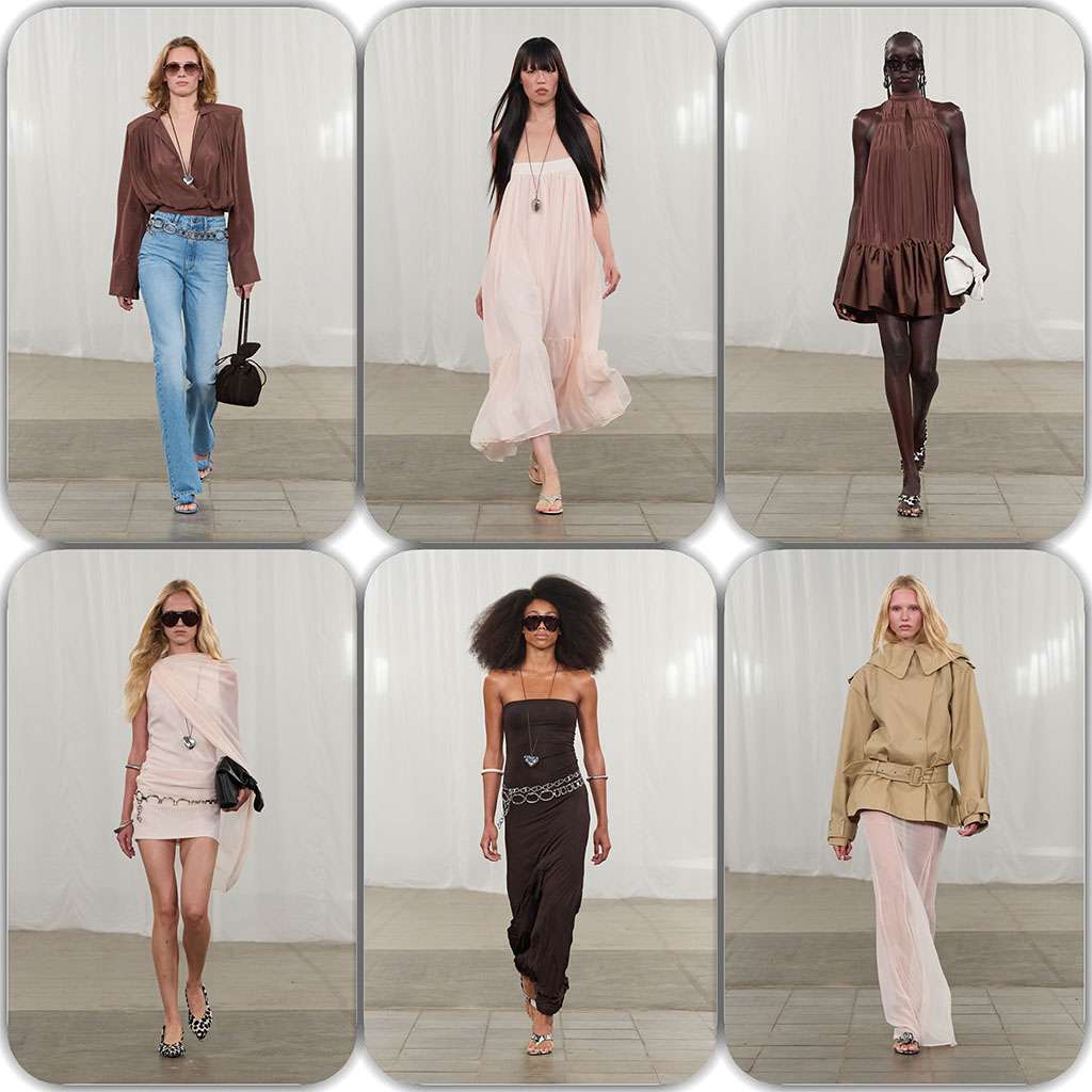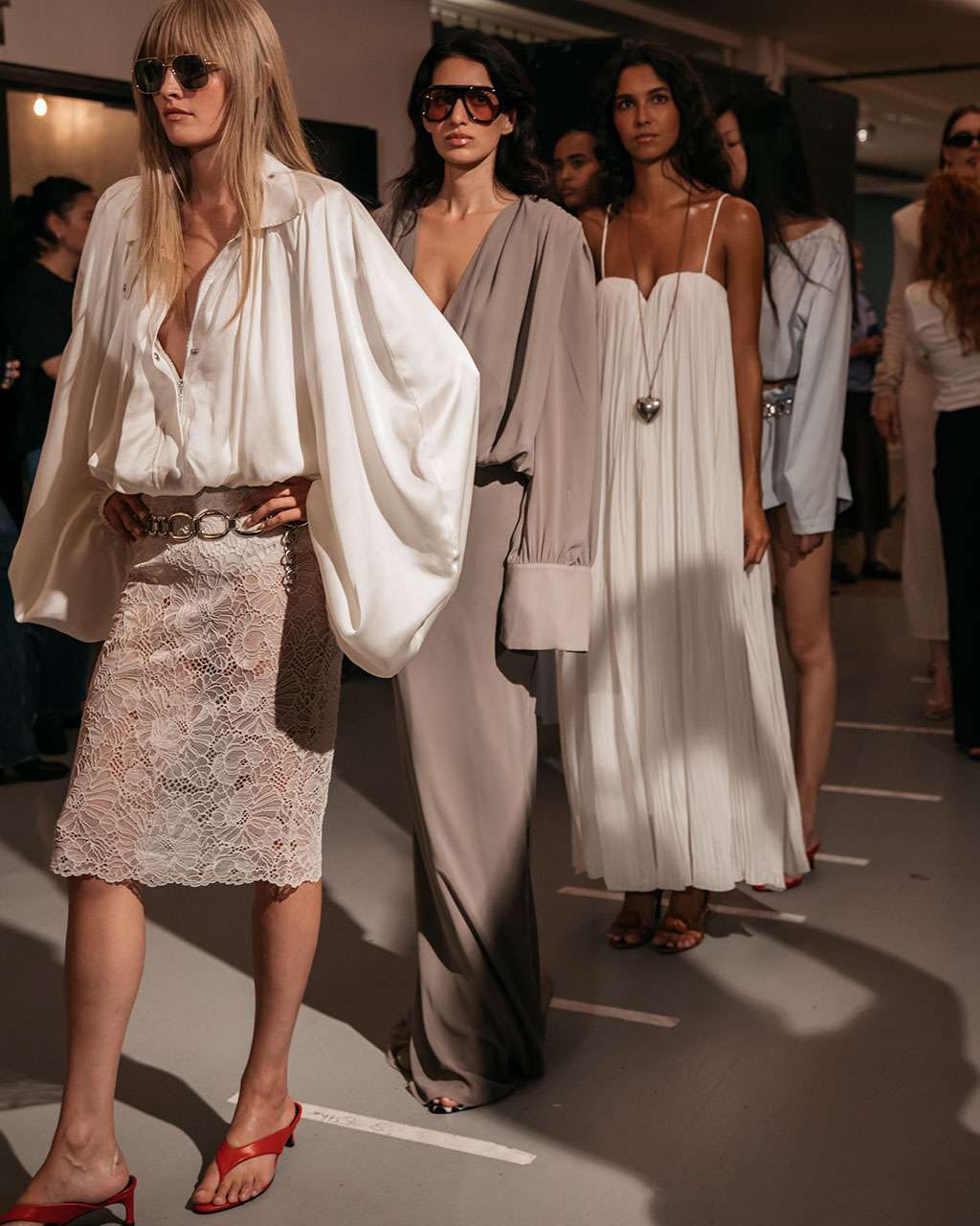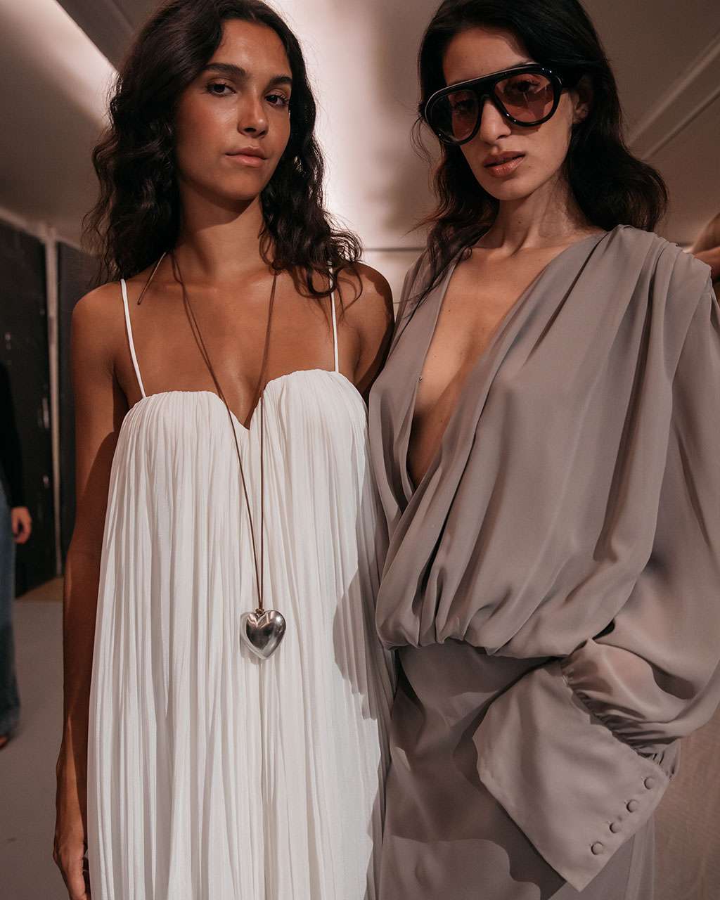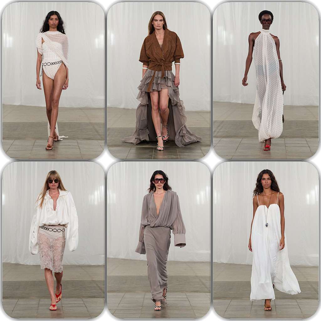 For Spring/Summer 2026, ROTATE presents its most feminine chapter yet — a high-summer reverie steeped in warmth, light, and nostalgia. The collection celebrates fluid silhouettes and tactile elegance, from sheer gowns and scarf-tied dresses to sharp linen tailoring and sculptural slip styles. Inspired by the golden glow of late afternoons, a palette of sun-washed neutrals and delicate pastels meets airy fabrics like satin, chiffon, and organic cotton.