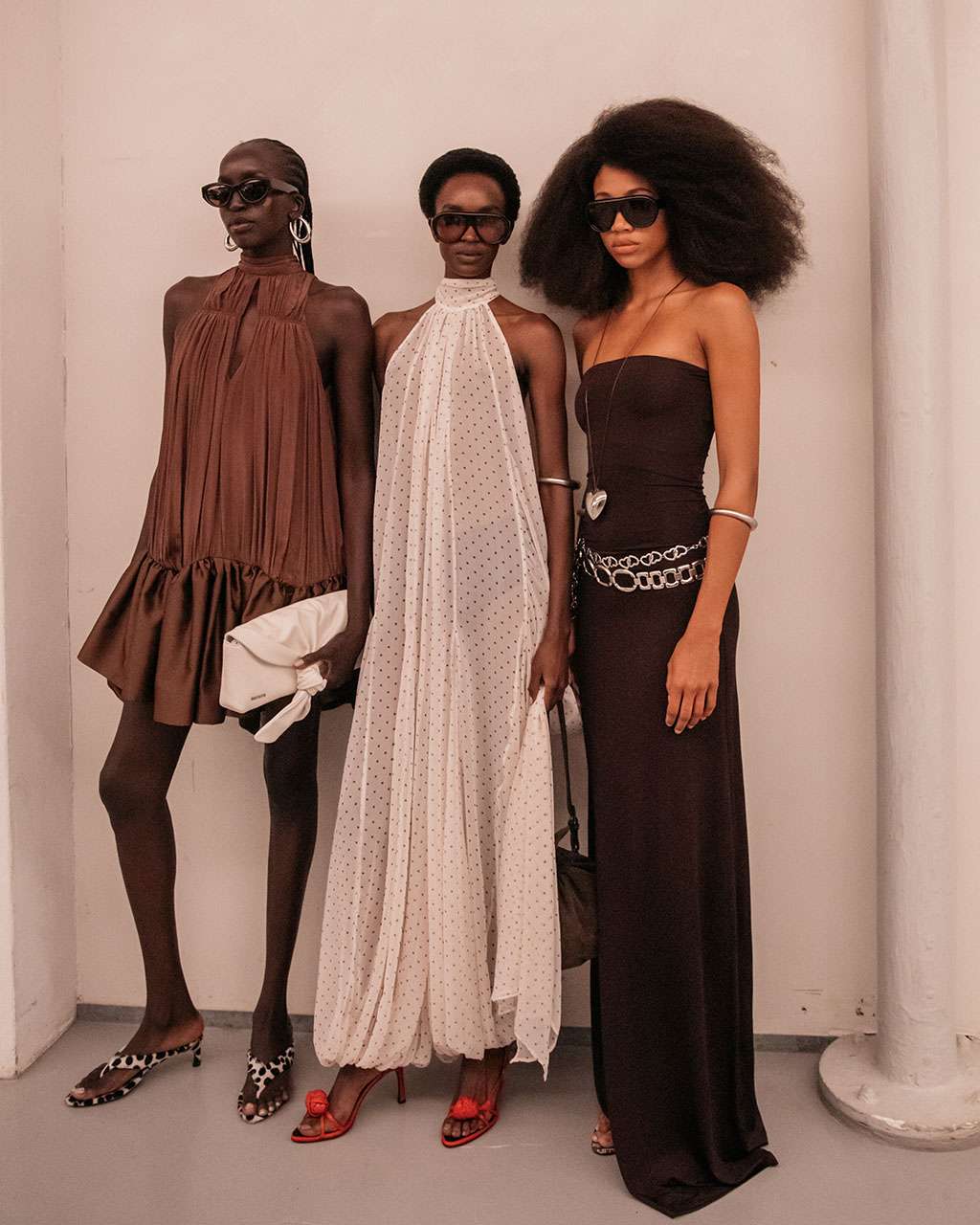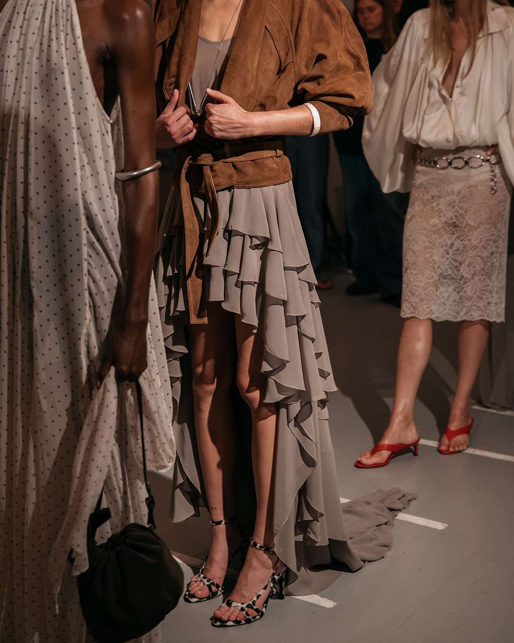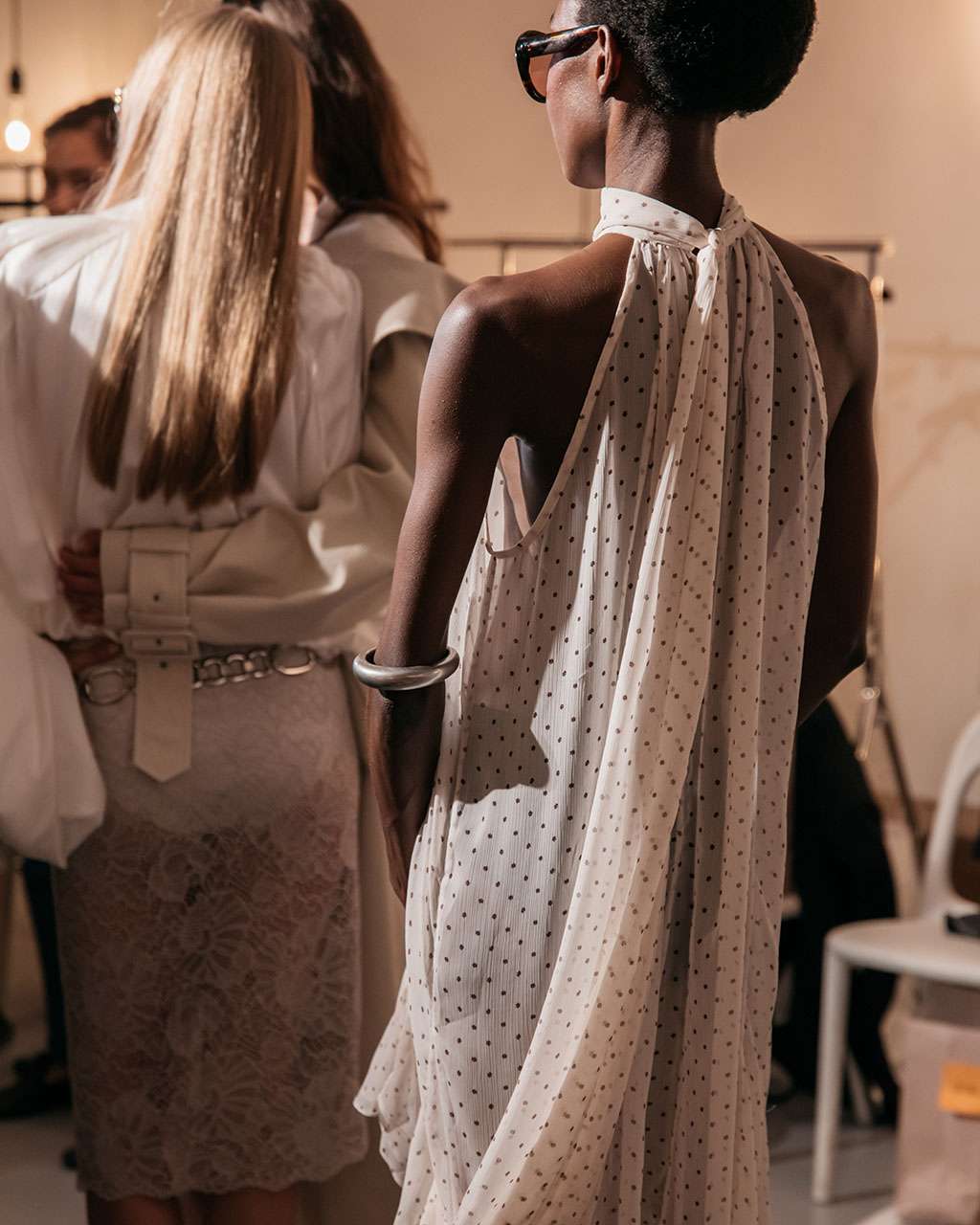 For Spring/Summer 2026, ROTATE presents its most feminine chapter yet — a high-summer reverie steeped in warmth, light, and nostalgia. The collection celebrates fluid silhouettes and tactile elegance, from sheer gowns and scarf-tied dresses to sharp linen tailoring and sculptural slip styles. Inspired by the golden glow of late afternoons, a palette of sun-washed neutrals and delicate pastels meets airy fabrics like satin, chiffon, and organic cotton.