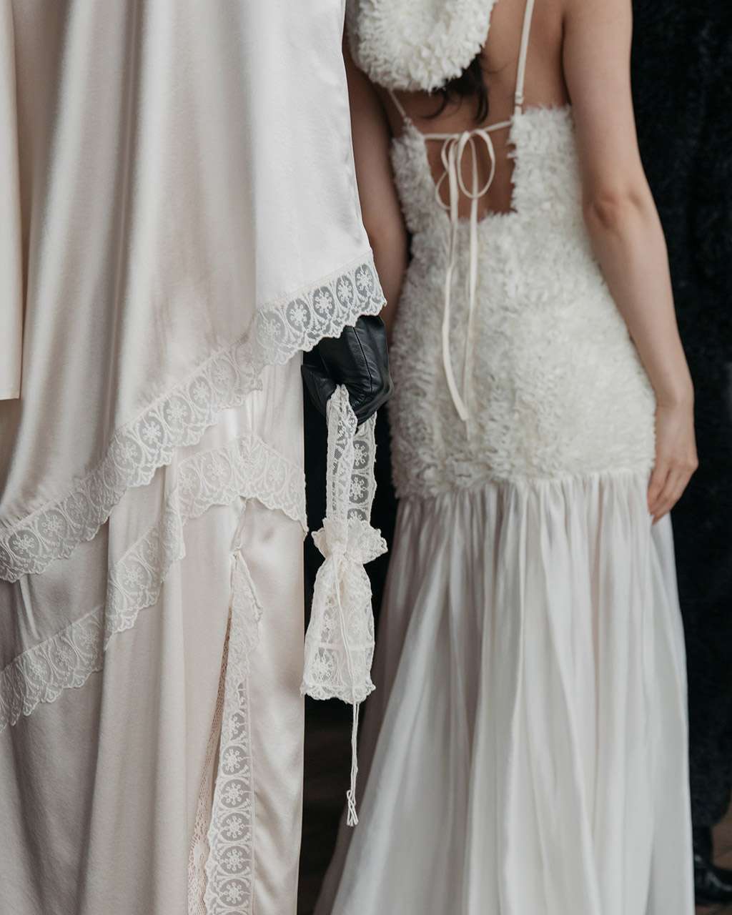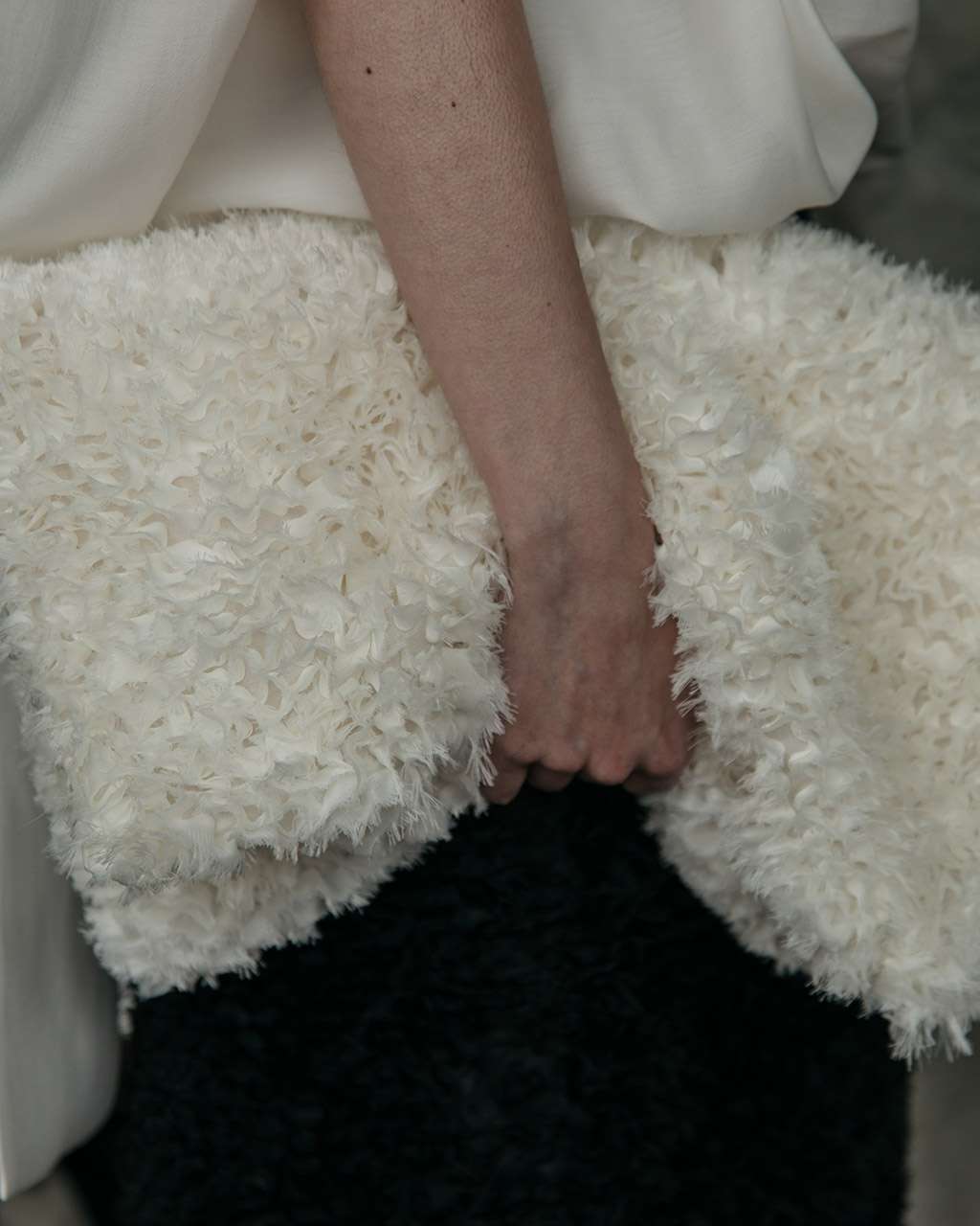 Subtle references to Macau emerge in the fluid elegance of reinterpreted silk dresses, balanced by a distinctly Nordic restraint. Layered transparencies soften the silhouette, while merino wool and double-faced fabrics introduce precision and warmth. Structured Portuguese herringbone adds architectural strength, creating harmony between delicacy and form.