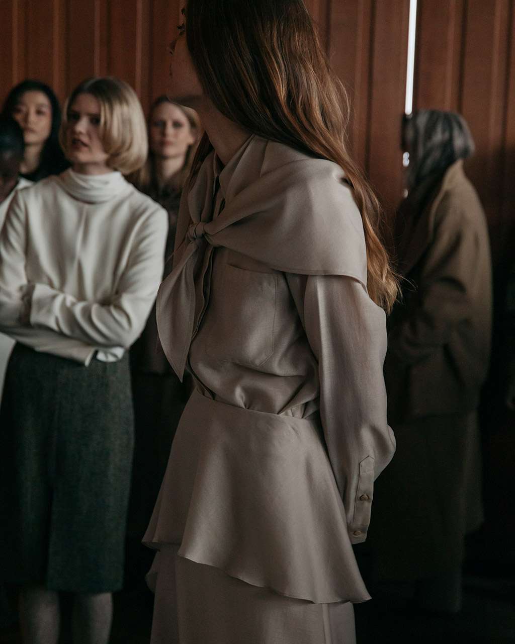 The palette remains grounded yet expressive: deep navy and black anchor the collection, while ivory and toast illuminate. Rich tones of merlot and espresso bring depth and intimacy. Silk contrasts with wool, transparency meets solidity, each piece designed for a woman who inhabits space with quiet confidence.