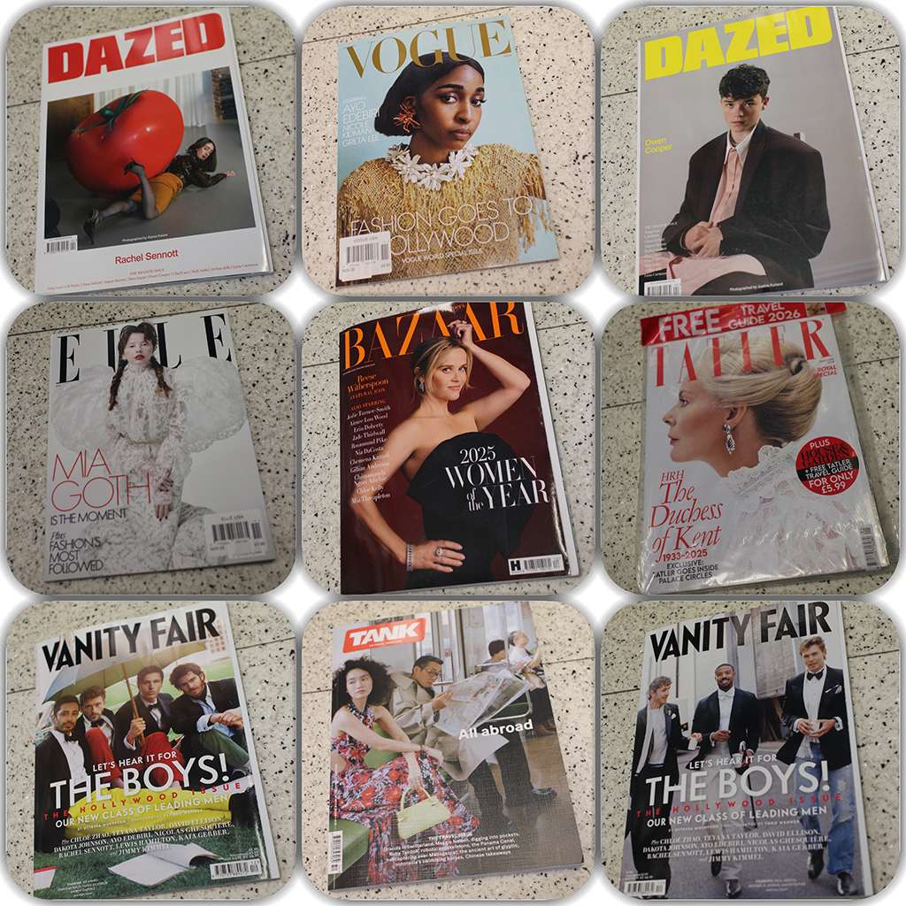“vogue” magazine…“elle” magazine… “harpers bazaar” magazine…“tatler” magazine..“vanity fair” magazine.